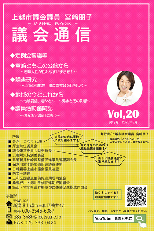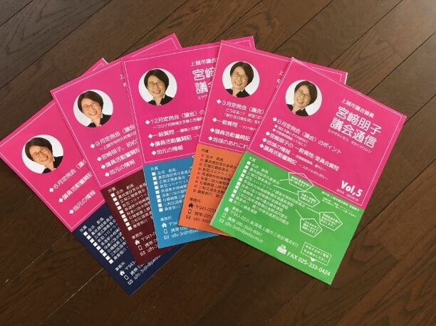定例会(議会)は年4回。カラーコンサルタントの経験を活かし議会通信は自身で制作。
