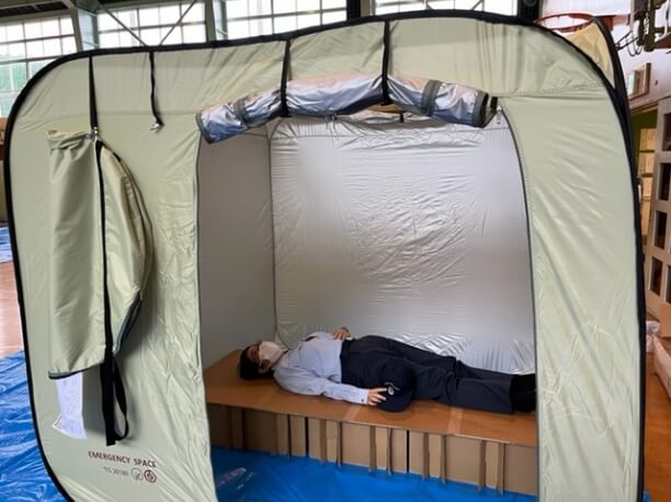 市内の消防や防災事業等に出席。避難所では段ボールベッドも完備